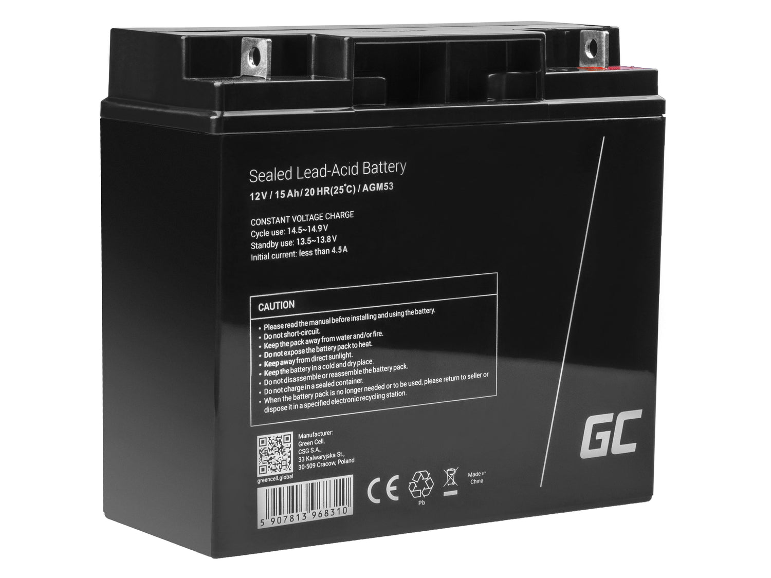 Green Cell AGM VRLA 12V 15Ah brez vzdrževanja Baterija za alarmni sistem, blagajno, igrače