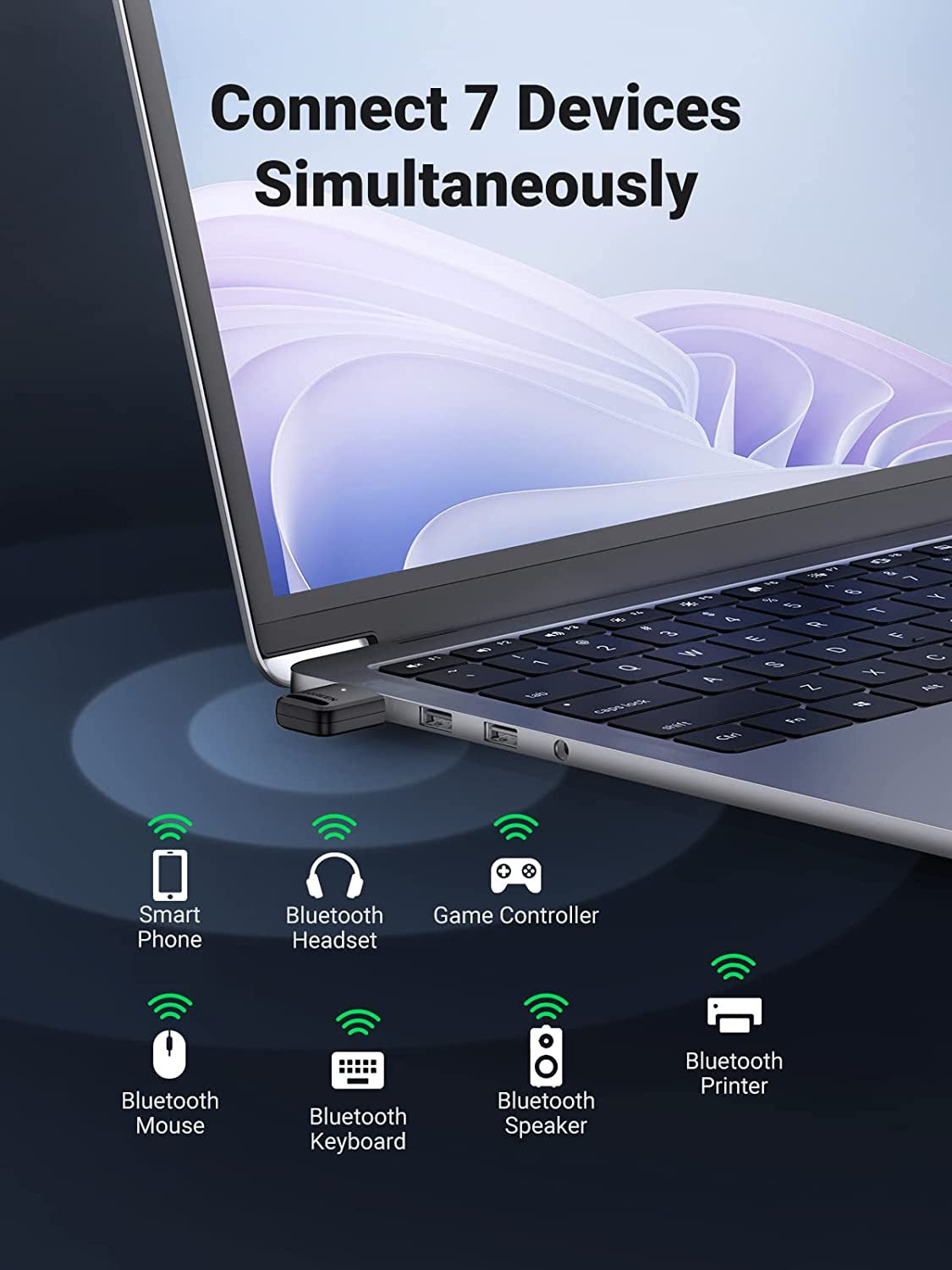 UGREEN V5.3 Bluetooth omrežni adapter omogoča vašemu računalniku povezavo do 7 naprav Bluetooth hkrati, kot so miška Bluetooth, tipkovnica, slušalke, zvočnik, krmilnik za igre, tiskalnik, telefon, tablica, projektor in več BLE ( naprave Bluetooth Low Energy).