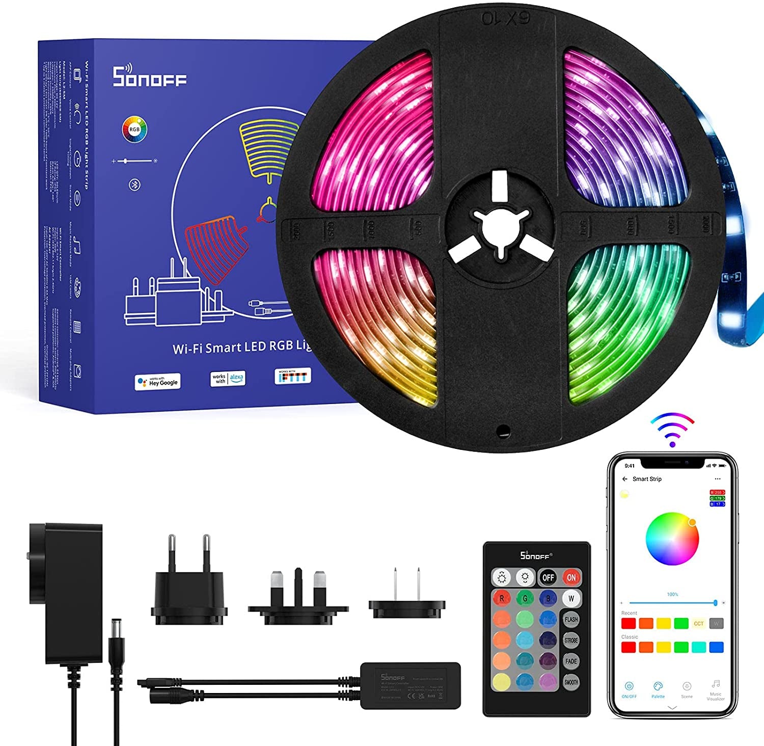 - Priložen LED trak, Wi-Fi modul, IR daljinski upravljalec in napajalnik