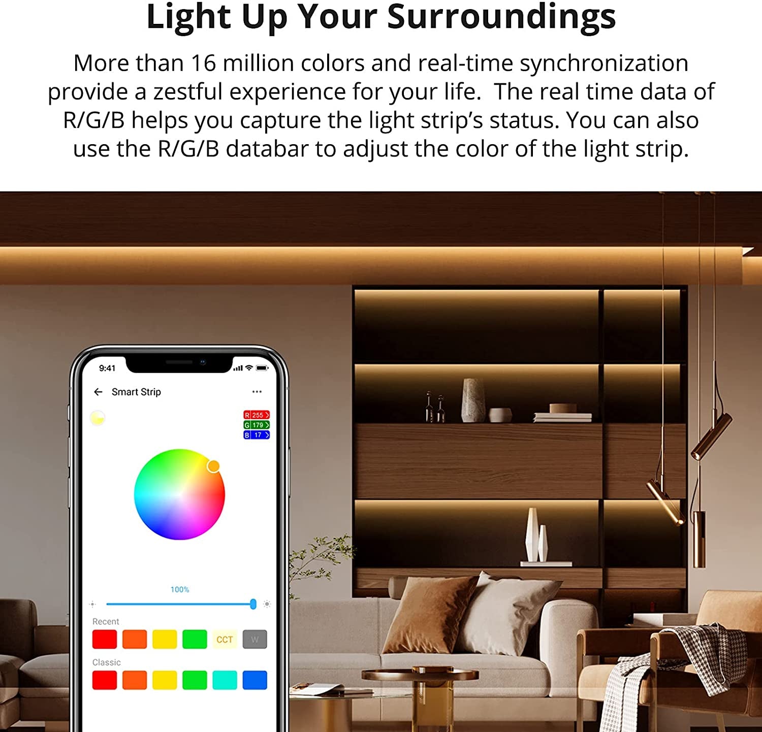 - Oddaljen vklop/izklop ter prilagajanje barve in svetilnosti