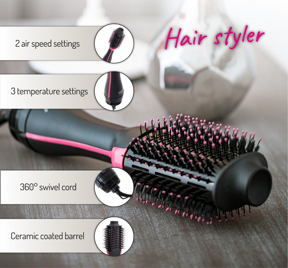 Odlična izbira za vse, ki želite poudariti lepoto svojih las. Elegantna krtača za oblikovanje z najlonskimi ščetinami omogoča enostavno razčesavanje las. Z močjo 1200 W in 3 nastavitvami temperature omogoča enostavno oblikovanje kodrov ali ravnanje las. Primerna je za sušenje, razčesavanje in ravnanje las, ter tudi za oblikovanje gostih las.