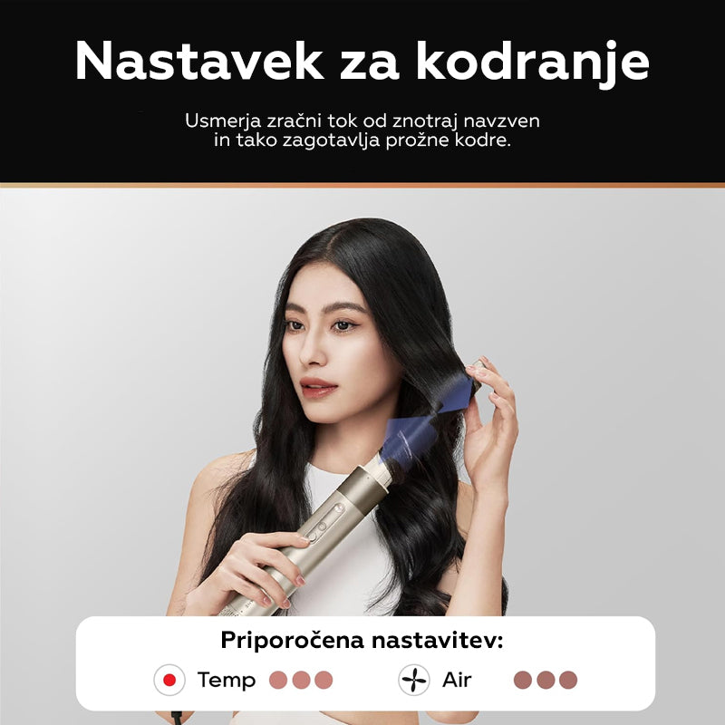 - Vsebina paketa: 1 x Ročaj, 1 x Valj za samodejno ovijanje, 1 x Okrogla volumenska krtača, 1 x Gladka krtača, 1 x Hiter sušilec, 1 x Nastavek proti razpršitvi las