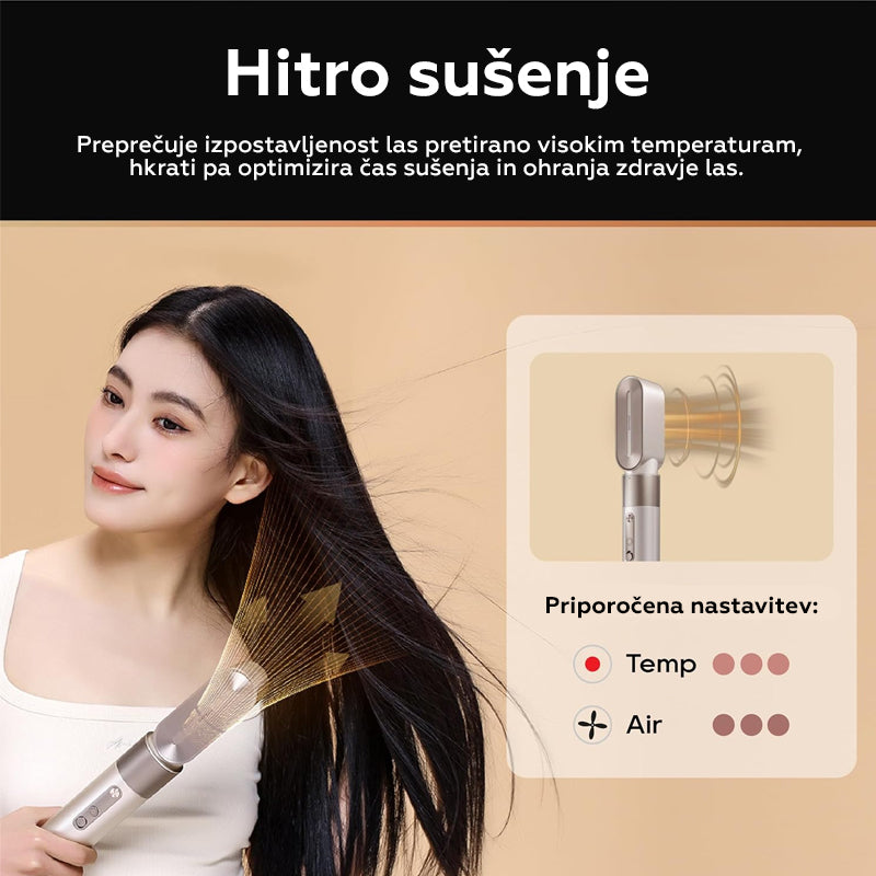 Nastavljanje delovanja s tremi stopnjami omogoča prilagojeno nastavitev temperature in hitrosti zraka za učinkovito stiliranje las, prilagojeno različnim tipom las in želenim rezultatom, od gladkih prinčesk do stilov z volumnom.