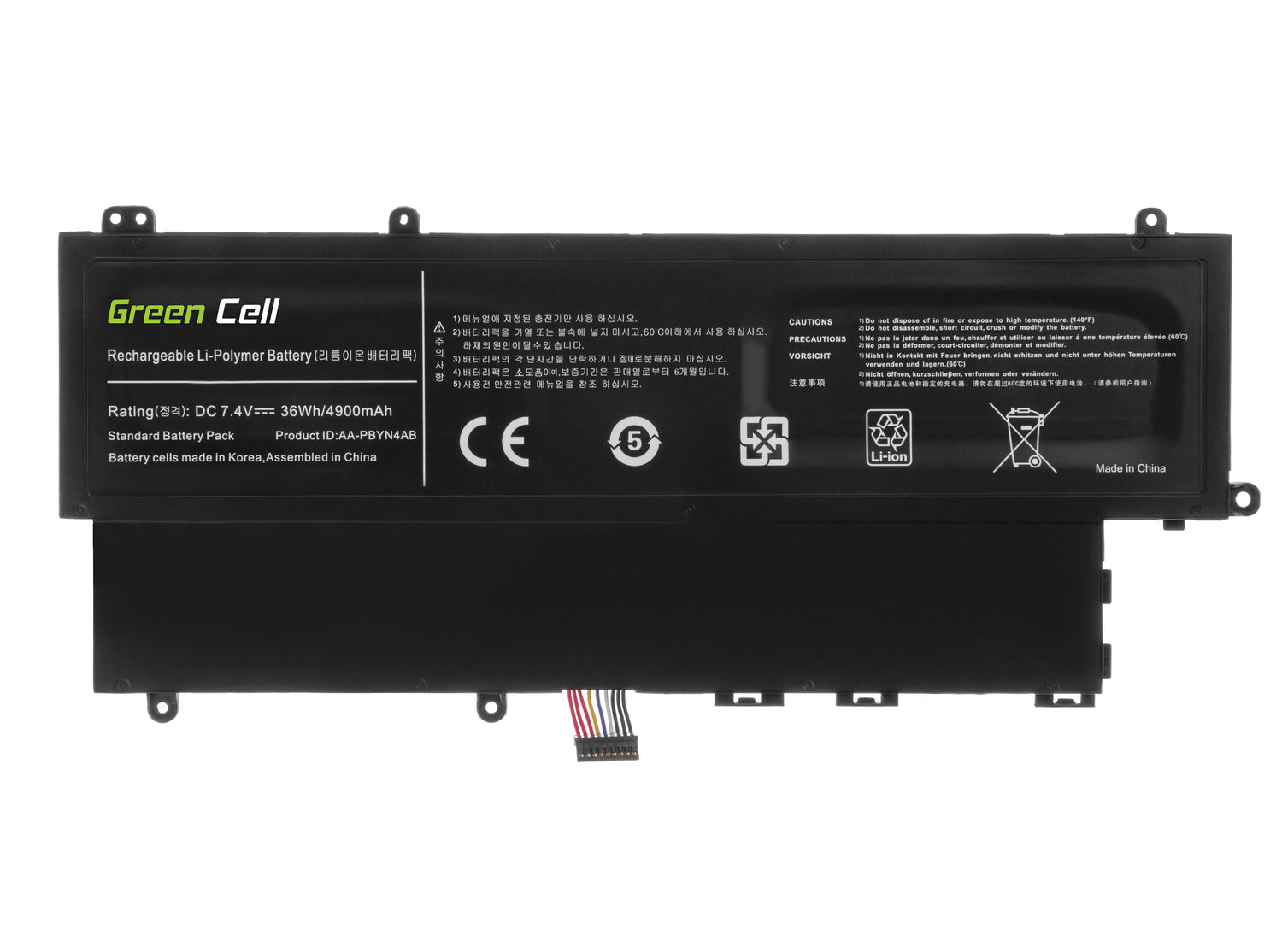 Jamstvo: 12 mjeseci; Napon: 7,6V (7,4)V; Broj ćelija: 6; Tehnologija: Li-polimer; Crna boja; Zaštita od prekomjernog pražnjenja: Da; Zaštita od preopterećenja: Da; Proizvođač: Green Cell; Težina: 0,55 kg; Kapacitet: 4900 mAh; Vrijeme rada: od 1,5 do 6 sati; Serije: Polymer;