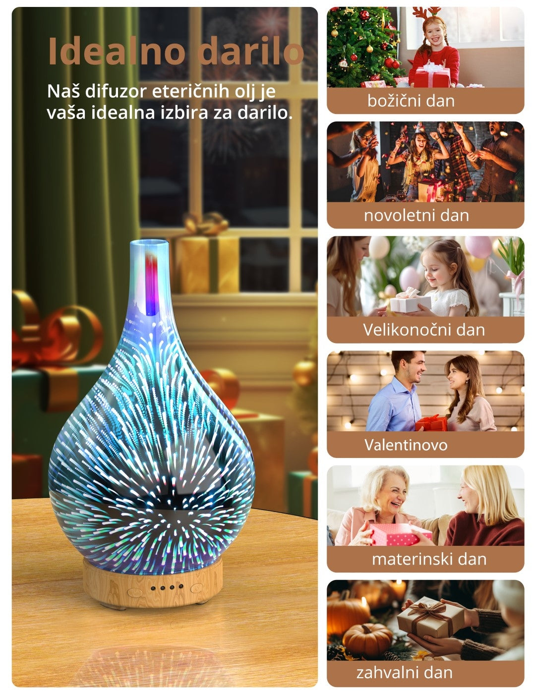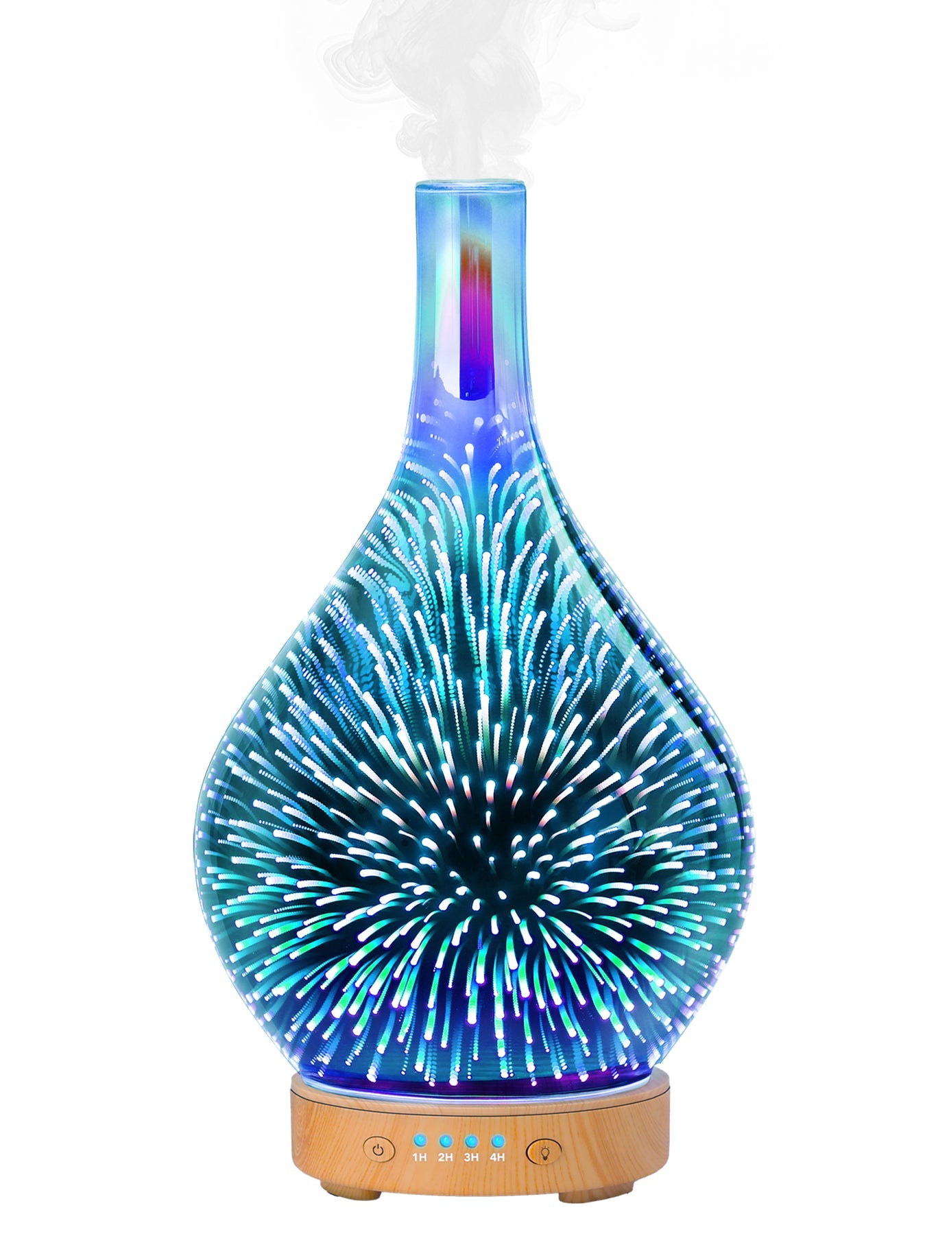 Iščete edinstveno in funkcionalno dekoracijo za svoj dom? Ta čudovit 3D ognjemetni difuzor eteričnih olj bo prava izbira! Izdelan je iz visokokakovostnega stekla brez BPA, kar pomeni, da je varen za otroke in hišne ljubljenčke. S kapaciteto 120 ml in nastavljivim časovnikom (1h, 2h, 3h) je idealen za hodnike, spalnice in dnevne sobe.