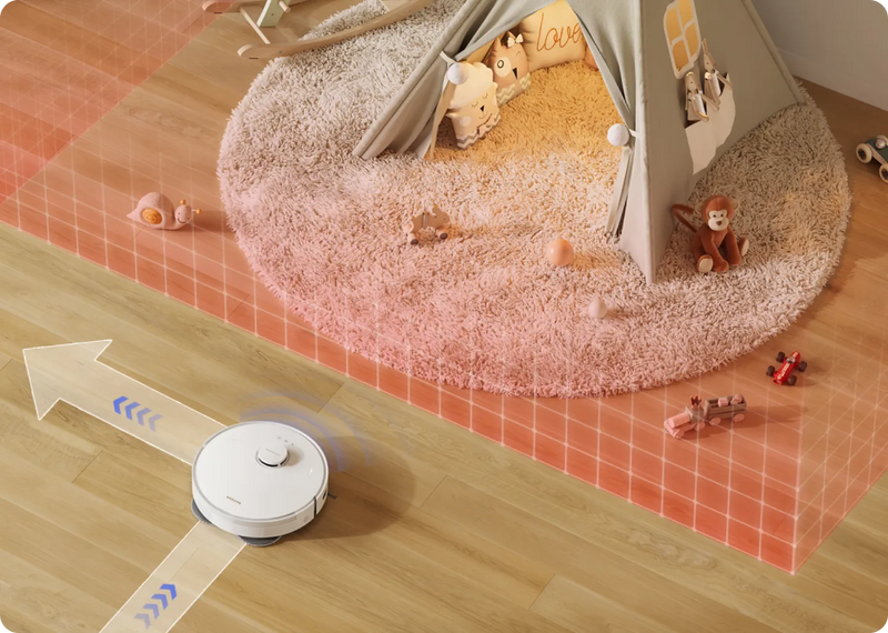 Ultrazvočna tehnologija za prepoznavanje preprog pomaga razlikovati med trdimi tlemi in preprogami ter tako določi ustrezno strategijo čiščenja.