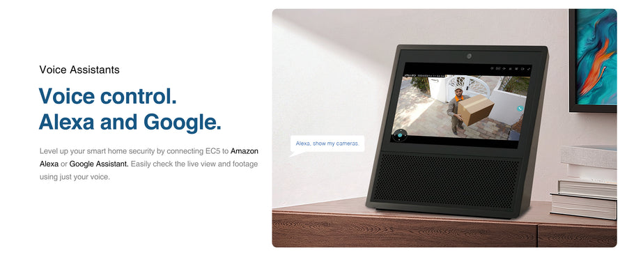 Izboljšajte varnost svojega pametnega doma z povezovanjem EC5 na Amazon Alexa ali Google Assistant. Preprosto preverite prenos v živo in posnetke s pomočjo svojega glasu.