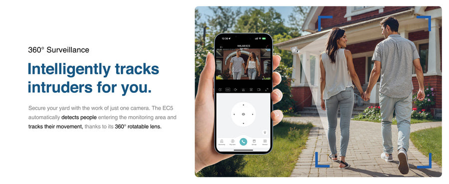 Zagotovite varnost svojega dvorišča z eno samo kamero. EC5 samodejno zazna osebe, ki vstopijo v nadzorovano območje, in sledi njihovemu gibanju zahvaljujoč svoji 360° vrtljivi leči.