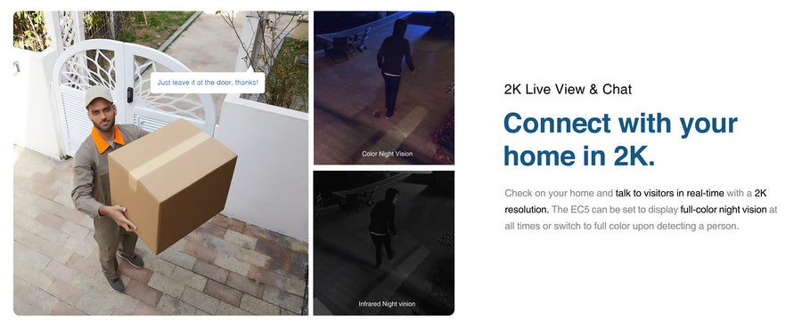 Spremljajte svoj dom in se pogovarjajte z obiskovalci v realnem času z ločljivostjo 2K. EC5 omogoča prikaz popolnega barvnega nočnega vida ves čas ali preklop na barvni prikaz ob zaznavi osebe.