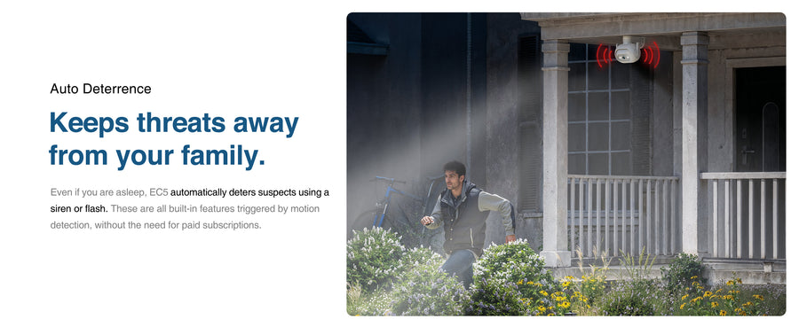 Tudi ko spite, EC5 samodejno odvrne osumljence z uporabo sirene ali bliskavice. Te funkcije so vgrajene in jih sproži zaznavanje gibanja, brez potrebe po plačljivih naročninah.