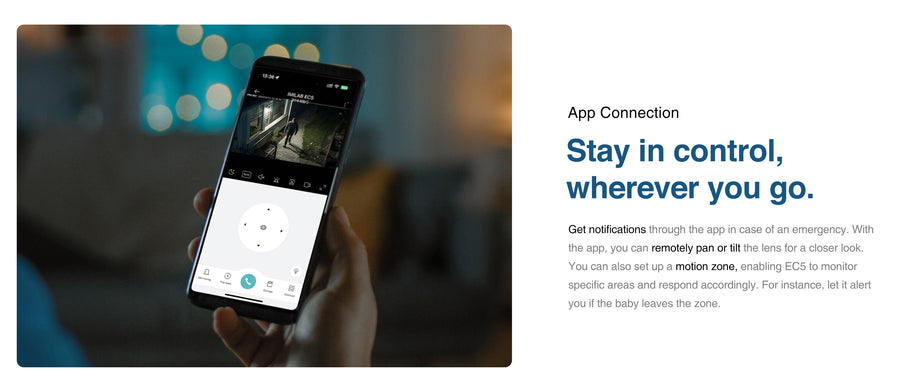 Prejemajte obvestila prek aplikacije v primeru izrednih razmer. Z aplikacijo lahko na daljavo premikate ali nagibate lečo za natančnejši pogled. Prav tako lahko nastavite območje zaznavanja gibanja, kar omogoča EC5, da nadzoruje specifična območja in se ustrezno odzove. Na primer, lahko vas opozori, če dojenček zapusti območje.
