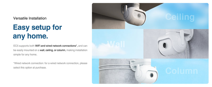 EC5 podpira tako WiFi kot žične omrežne povezave* in ga je mogoče enostavno namestiti na steno, strop ali steber, kar omogoča preprosto namestitev v katerem koli domu.