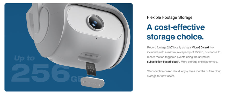 Posnetke snemajte 24/7 lokalno z uporabo MicroSD kartice (ni priložena) z največjo kapaciteto 256 GB ali izberite snemanje dogodkov, sproženih z gibanjem, z uporabo neomejenega shranjevanja v oblaku na podlagi naročnine*. Na voljo imate več možnosti shranjevanja.