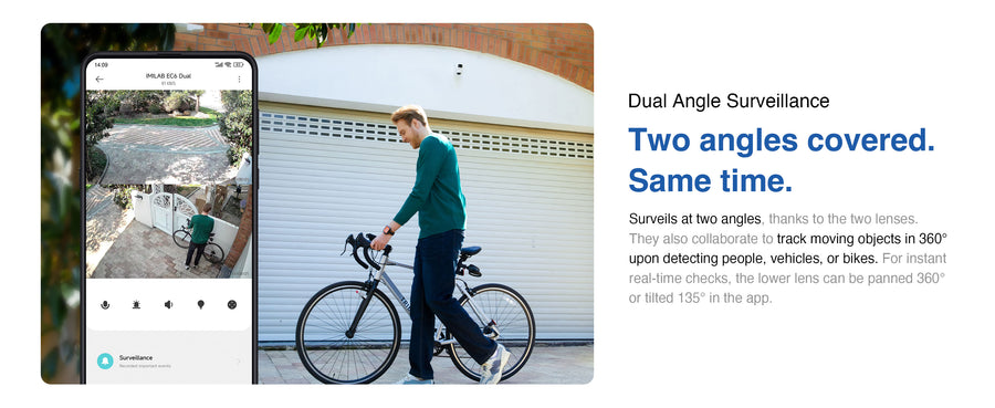 Spremlja pod dvema kotoma zahvaljujoč dvema lečama. Sodelujeta tudi pri sledenju premikajočih se objektov v 360° pri zaznavi ljudi, vozil ali koles. Za trenutni pogled v živo je spodnjo lečo mogoče zavrteti za 360° ali nagniti za 135° v aplikaciji.