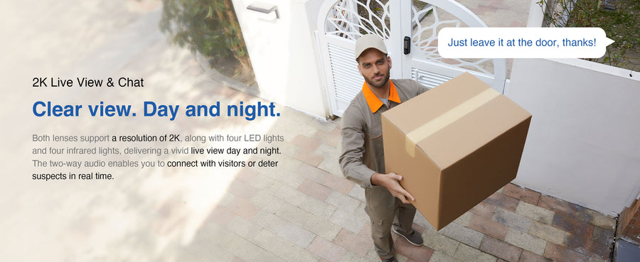 Obe leči podpirata ločljivost 2K skupaj s štirimi LED-lučmi in štirimi infrardečimi lučmi, kar omogoča živahen pogled v živo podnevi in ponoči. Dvosmerni zvok vam omogoča, da se v realnem času povežete z obiskovalci ali odvrnete sumljive osebe.