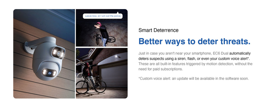 V primeru, da niste blizu svojega pametnega telefona, EC6 Dual samodejno odvrne osumljence z uporabo sirene, bliskov ali celo vašega lastnega glasovnega opozorila*. Vse te funkcije so vključene in sprožene z zaznavanjem gibanja, brez potrebe po plačljivih naročninah.
