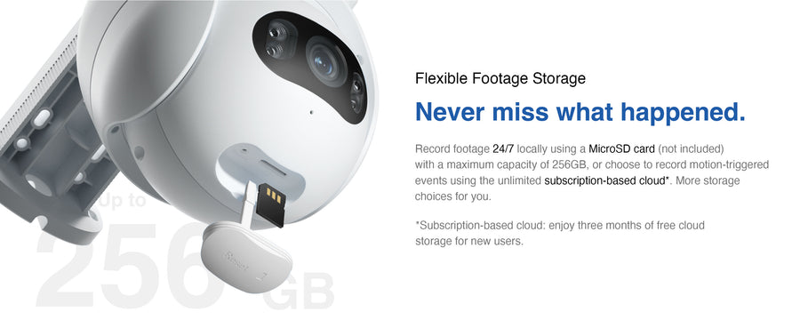 Posnetke lahko snemate 24/7 lokalno z uporabo MicroSD kartice (ni priložena) z največjo kapaciteto 256 GB ali pa snemate dogodke, sprožene z zaznavanjem gibanja, z uporabo neomejenega oblaka na podlagi naročnine. Več možnosti shranjevanja za vas.